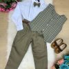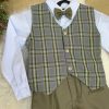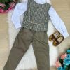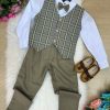 Conjunto composto por: Camisa Social na cor Branca, Gravata Borboleta na verde, Cinto na Cor marrom, Calça verde e colete xadrez