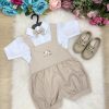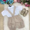 Conjunto composto por: Camisa social na cor Branca, Jardineira na cor bege e gravata borboleta Bege