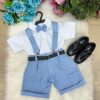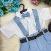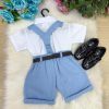 Acompanha gravata borboleta azul claro, suspensório azul claro com regulagem e cinto ajustável preto com fivela metálica.