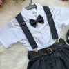 Acompanha gravata borboleta azul petroleo, suspensório azul petroleo com regulagem e cinto ajustável preto com fivela metálica.