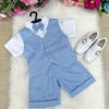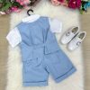 Conjunto composto por: Camisa social na cor Branca, gravata borboleta AZUL BEBÊ shorts na cor AZUL BEBÊ, Colete AZUL BEBÊ e Cinto PRETO