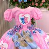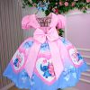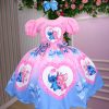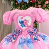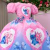 Esse vestido temático combina delicadeza, conforto e um toque de magia com a estampa dos personagens Stitch e Angel — perfeito para aniversários, ensaios fotográficos, festas temáticas ou para as pequenas que amam se sentir princesas.