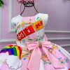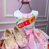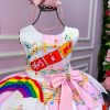 Confeccionado em tecido misto possui forro em poliéster e algodão para não incomodar a criança e proporcionando um caimento incrível e sofisticado, possui gola redonda, comprimento médio, mangas curtas, apliques de laço e perolás, contém, também, elástico nas costas para melhor ajuste.